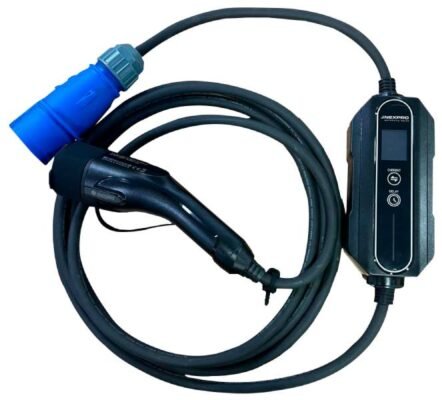 Ideal para motoristas autônomos e pequenas operações urbanas, o carregador portátil de 7 kW se destaca pela praticidade. Com conector Tipo 2 (T2) para o veículo e plugue industrial para a rede elétrica, ele permite o carregamento do VUC elétrico em diferentes locais, sem necessidade de instalação fixa.