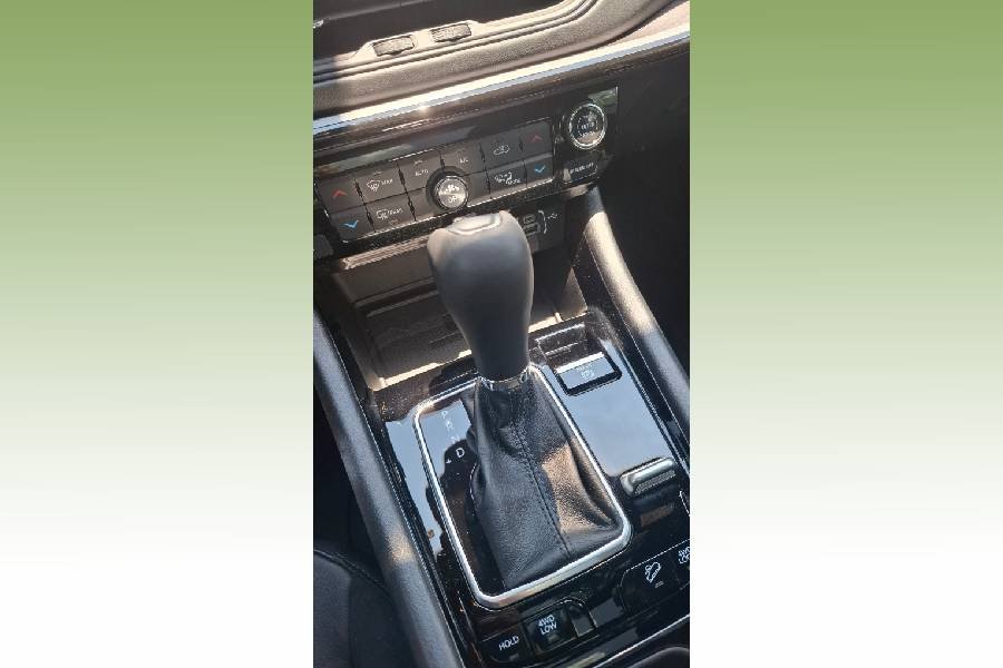 A transmissão é automática de nove marchas à frente e uma à ré. A primeira relação é 4,7:1 e a nona 0,48:1, com diferencial 3,734. O escalonamento busca conciliar aceleração e regime reduzido em velocidade de cruzeiro. O sistema de tração é 4×4 com seletor de terrenos e reduzida, permitindo variação de entrega de torque conforme o tipo de piso. O modelo conta ainda com Hill Descent Control para controle eletrônico em descidas.