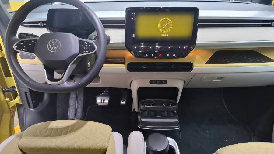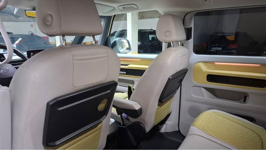 Os bancos dianteiros possuem ajustes elétricos, apoio lombar e função de massagem. O habitáculo também utiliza materiais reciclados e insumos de origem não animal no acabamento. Mais um detalhe, na nossa ID Buzz amarela, no interior “vegano” feitos com materiais recicláveis, também predominava com a cor.